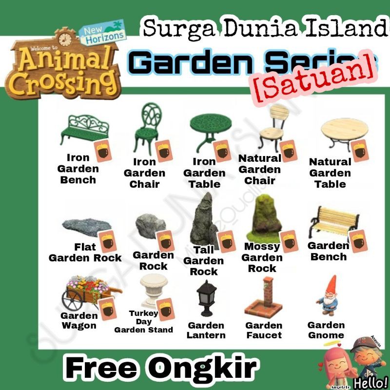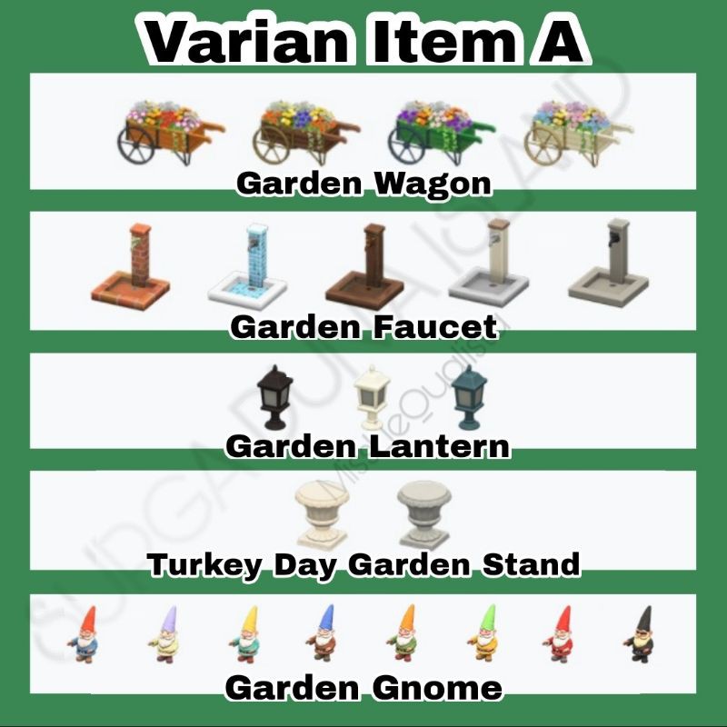 Garden bench Garden faucet Garden gnome Garden lantern Garden wagon Garden rock Mossy garden rock Tall garden rock Flat garden rock Variations and customizations of the different pieces are listed below. Benedict Biskit Derwin Dom Elmer Felicity Ketchup Mac Mallary Rasher Scoot Sparro Winnie. If you want to use Animal Crossing.